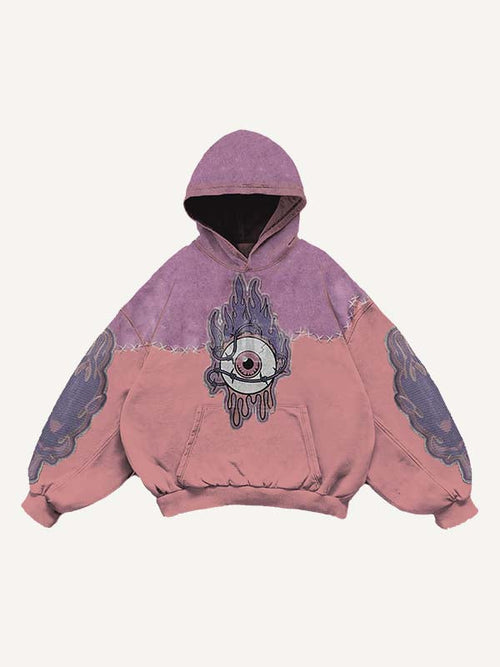 Distressed Washed Wing&Eye&Graphic Print Slant Pockets Hoodie -